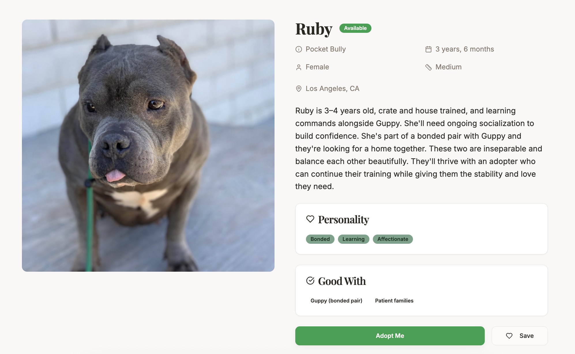 From a user perspective, it's simple: browse dogs, apply, track your application. But under the hood, it's built for production—with encrypted PII, role-based access control, audit logging, and the infrastructure to grow as the rescue takes in more dogs, volunteers, and donations.