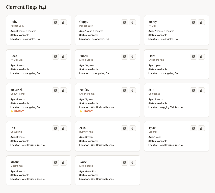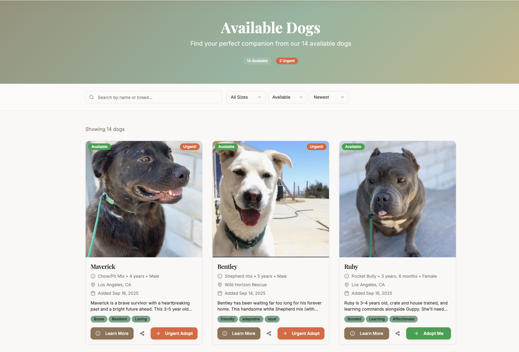 Full dog profiles with personality traits, compatibility info, photo galleries, and urgent adoption flags