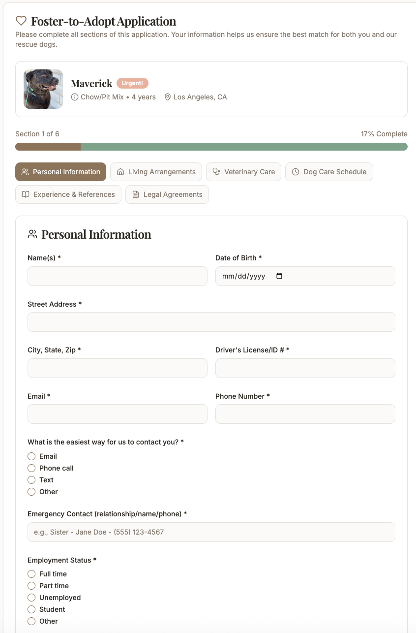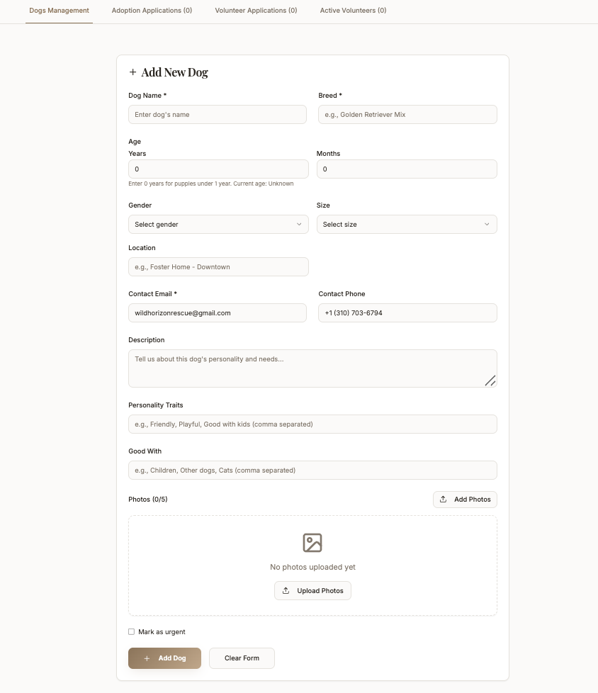 Purpose: Wild Horizon Rescue was created to replace manual workflows that burned out rescue admins. Too many rescues rely on spreadsheets, email chains, and scattered platforms. This app gives them a unified system where applications flow in automatically, sensitive data is encrypted and audited, and volunteers can self-onboard. The result: a rescue that can scale without losing quality or burning out.
